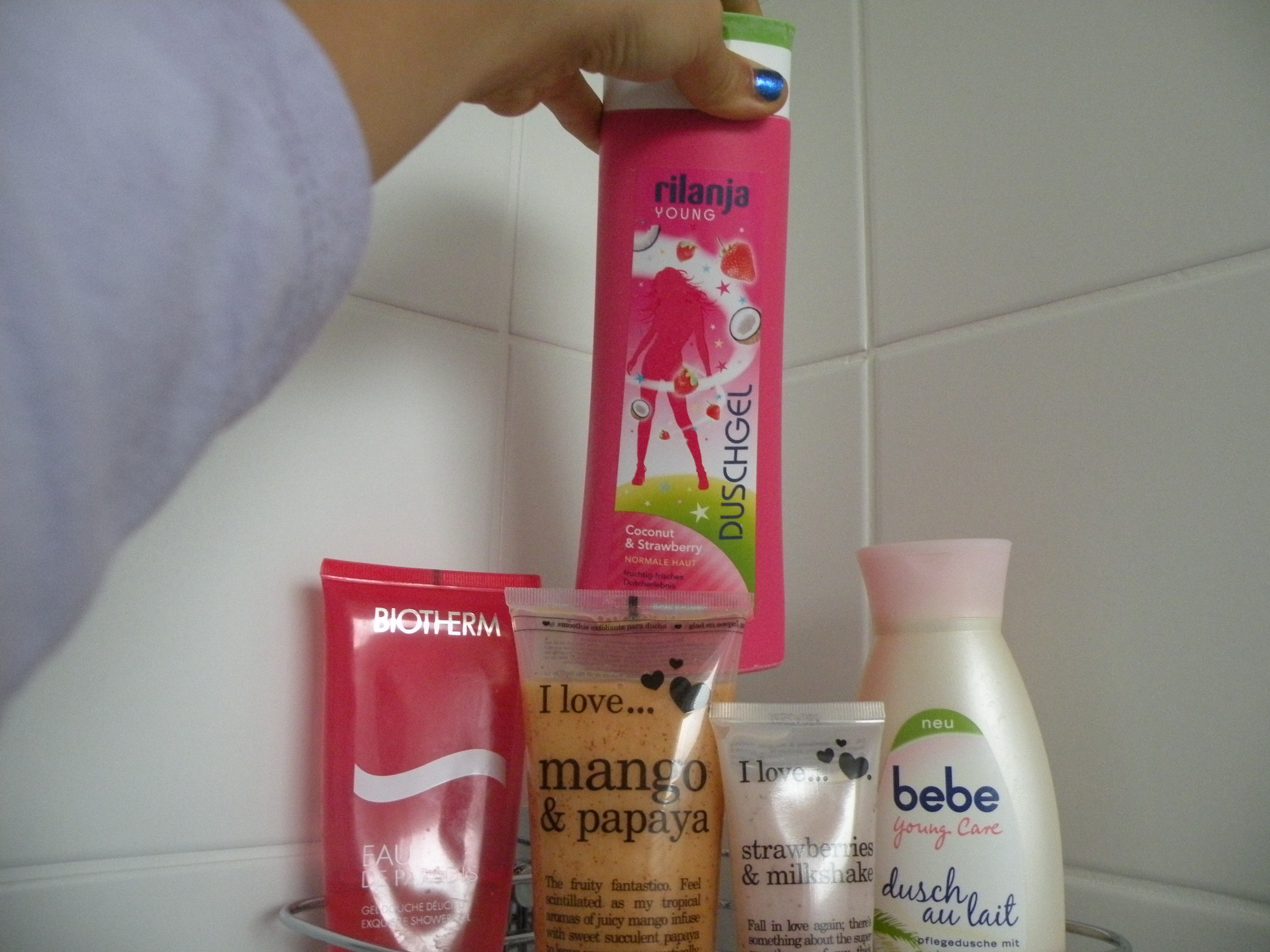 In der Mitte: I love... ❤❤ ❤ mango & papaya Dusch-Peeling & I love... ❤❤ ❤ strawberry & milkshake Dusch-smoothie (hört sich komisch an, ist aber toll!)